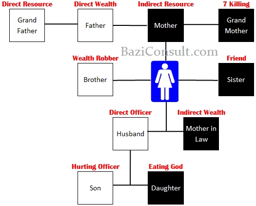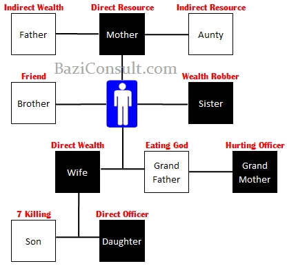 Technically speaking, the 10 gods represents many things or relationships in Bazi or Destiny Analysis but today we are going to talk about Family Relationships. This is easier to illustrate.