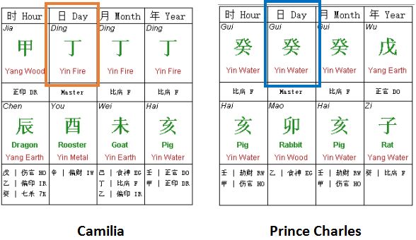 As you can see from the chart above, Camilia is a Ding Day master while Prince Charles is a Gui day master. In the study of Bazi, Ding – Gui relationship is known as 6 clashes. Clash in Chinese is known as Chong 冲, Chong means a clash or a powerful dash. It gives a feeling of opposition.