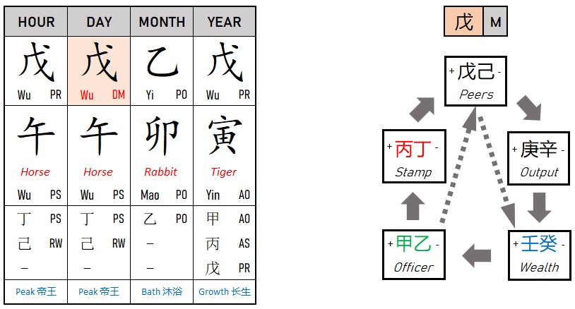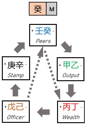 Output element is what the Day master produces. For this chart, it is the Metal element. If you examine the Bazi Chart above, yes this male, do not have any Output element.