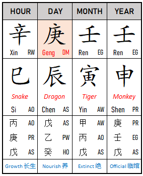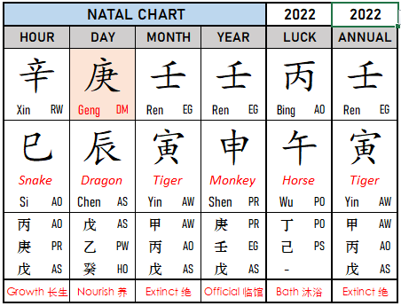 But, we can’t oversimplify Bazi destiny reading by saying so. We have to take into consideration the entire chart’s formation. some other important points are for example the clash, the existence of the two Ren 壬 Water as well as the Xin 辛 in the hour pillar.
