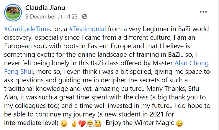 Would like to express my gratitude and big thank you to Master Alan for his patience and guidance on my journey to learn CM. Attended the Bazi Class for Beginners. The methology used to teach us was simple and clear, easy for newbies to apply. Even with only a 3 days beginner course, we are able to read charts which was a great achievement for me personally.